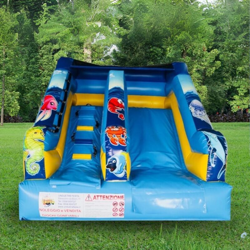Noleggio scivolo gonfiabile per interni Disponibili a noleggio tanti scivoli per bambini, in particolare questo coloratissimo gioco gonfiabile a tema mare. Se stai organizzando una festa o evento, questo gioco sarà l’ideale! Perfetto da mettere in casa, in giardino o in un qualsiasi ambiente al chiuso. Le dimensioni ridotte infatti, lo rendono molto comodo da […]